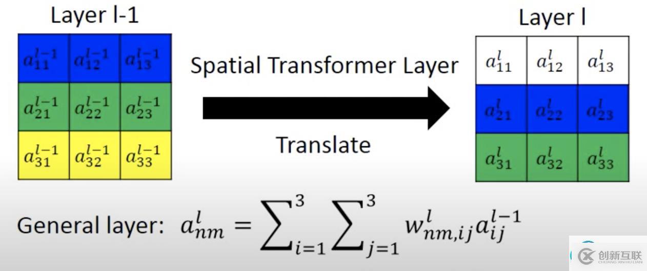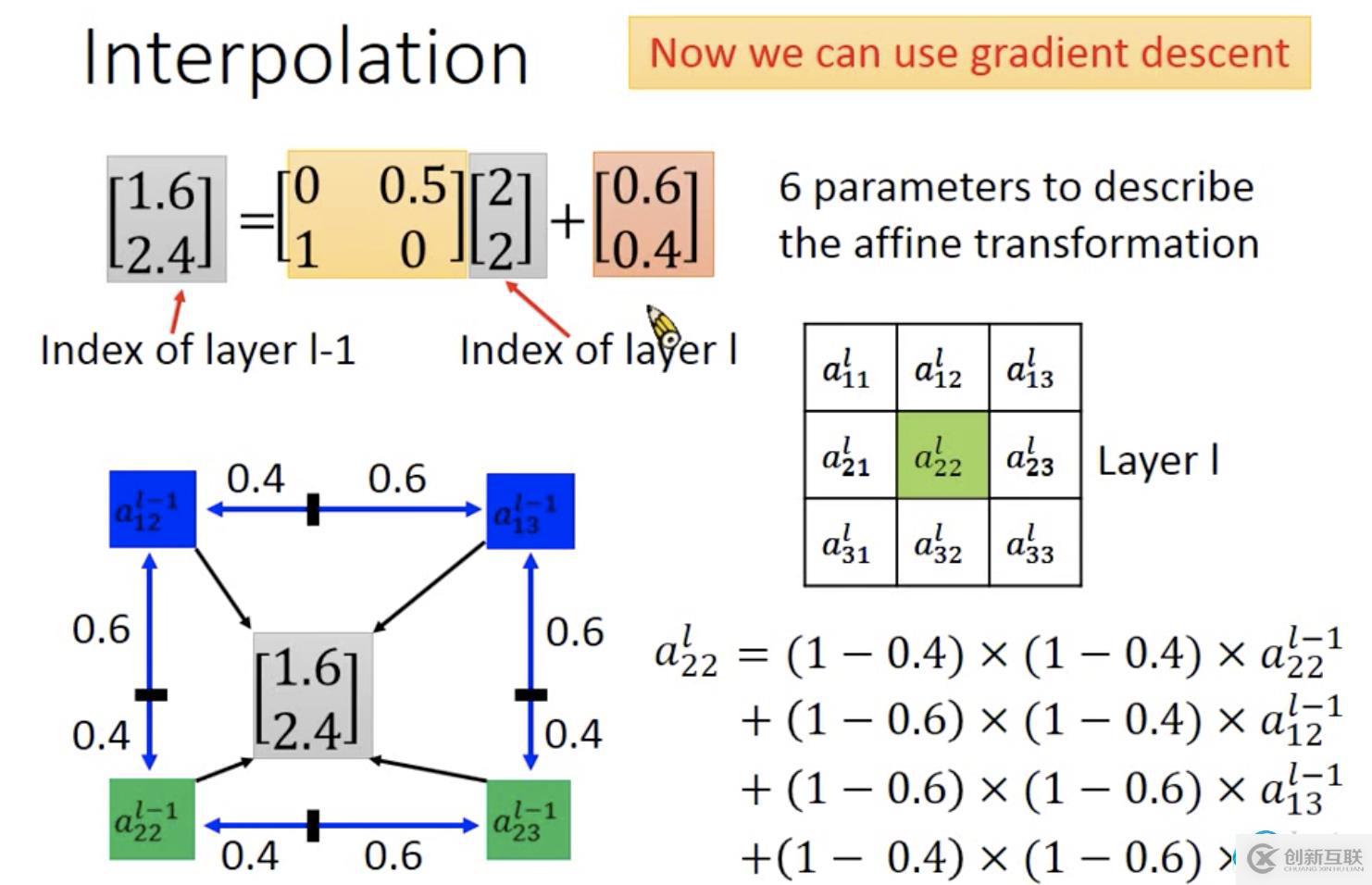 于是,作者就采用了插值的方法來進(jìn)行采樣。比如當(dāng)坐標(biāo)為 [ 1.6 , 2.4 ] [1.6,2.4] [1.6,2.4] 時(shí),就用 [ a 12 l ? 1 , a 13 l ? 1 , a 22 l ? 1 , a 23 l ? 1 ] [a_{12}^{l-1}, a_{13}^{l-1}, a_{22}^{l-1}, a_{23}^{l-1}] [a12l?1?,a13l?1?,a22l?1?,a23l?1?]這幾個(gè)值進(jìn)行插值。這樣一來 [ a , b , c , d , e , f ] [a,b,c,d,e,f] [a,b,c,d,e,f] 發(fā)生微小的變化之后, [ x , y ] [x,y] [x,y] 位置采樣得到的值也會(huì)有變化了。這也使得 spatial transformer 可以放到任何層,跟整個(gè)網(wǎng)絡(luò)一起訓(xùn)練。