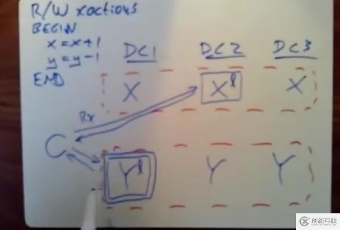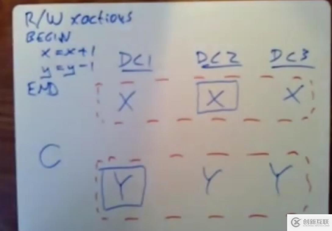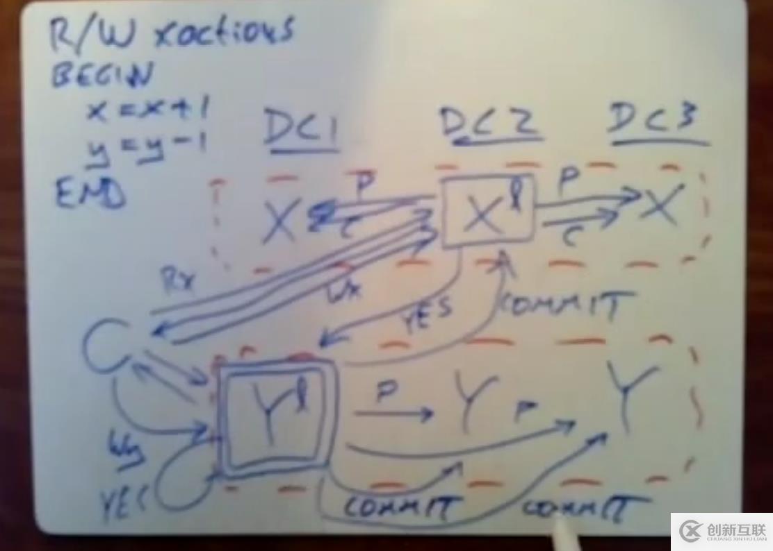 一個讀寫型事務(wù),一個銀行的轉(zhuǎn)賬事務(wù),賬戶Y轉(zhuǎn)賬給賬戶X一塊錢,X賬戶的數(shù)據(jù)和Y賬戶的數(shù)據(jù)分別保存在不同的服務(wù)器上,但是這些數(shù)據(jù)都會經(jīng)過復(fù)制到多臺服務(wù)器上。