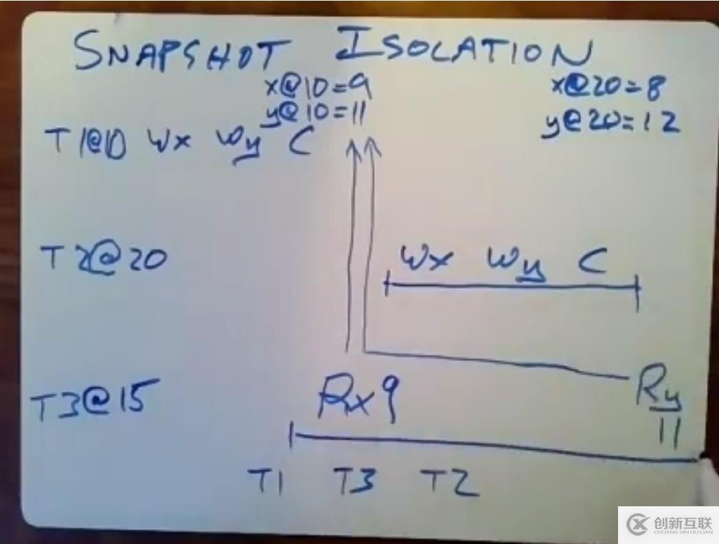 因此,只讀事務(wù)在進(jìn)行處理時,即便碰到了上面圖片的問題,T1事務(wù)提交時間假設(shè)為10,T3只讀事務(wù)的開始時間假設(shè)為15,T2事務(wù)的提交時間為20,但是T3事務(wù)執(zhí)行Ry操作的時間為21,在21這個時間,T3事務(wù)在讀取y的數(shù)值時,看到有時間戳為10和20兩個版本的結(jié)果,根據(jù)T3事務(wù)的時間戳為15,會讀取時間戳為10的那個版本的數(shù)值并返回。