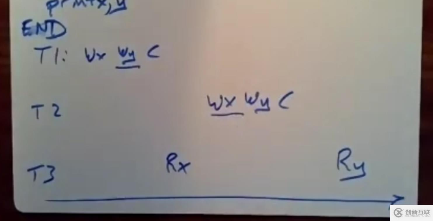 如圖所示的情況下,T1和T2為讀寫型事務(wù),T3為只讀型事務(wù),如果不采取措施,那么T3事務(wù)讀取返回的結(jié)果為,x為T1事務(wù)修改的結(jié)果,而y為T2事務(wù)修改的結(jié)果,然而正確的返回結(jié)果應(yīng)該讀取T1事務(wù)修改的x、y值。