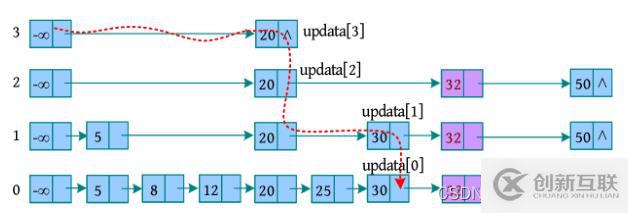 例如,跳躍表如下圖所示,在表中插入元素 32。首先在跳躍表中查找 32,然后確定插入位置。在查找過(guò)程中用 updata[i] 記錄經(jīng)過(guò)的每一層的大節(jié)點(diǎn)位置;假設(shè)隨機(jī)化得到的層次為 2,則 i 為 0~2,將新節(jié)點(diǎn)插入 updata[i] 之后。
