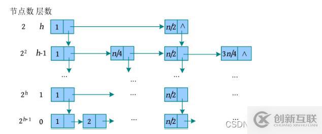 若有 n 個(gè)元素,則增加 h 級(jí)索引后的數(shù)據(jù)結(jié)構(gòu)如下圖所示。