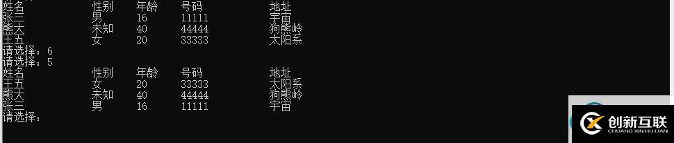 printf("%-10s\t%-6s\t%-5s\t%-12s\t%-20s\n", "姓名", "性別", "年齡", "號碼", "地址");