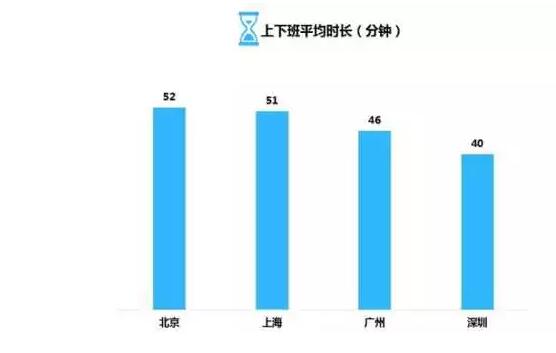 整體來看,北京平均上班要52分鐘,上海要51分鐘,差異不是很大,廣州需46分鐘,深圳得40分鐘。