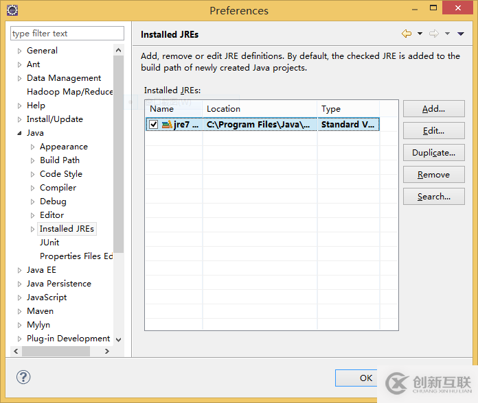 1.在 Eclipse 菜單中點擊 Window -> Preferences,在彈出框中左側(cè)選擇展開 Java 節(jié)點,點擊 Installed JREs,此時右邊窗口會顯示已經(jīng)加載的 JRE。