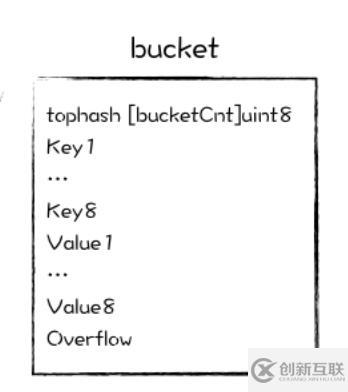 bmap --- 代表bucket,每一個(gè)bucket最多放8個(gè)kv,最后由一個(gè)overflow字段指向下一個(gè)bmap,注意key、value、overflow字段都不顯示定義,而是通過maptype計(jì)算偏移獲取的。