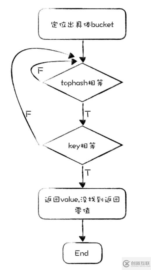 在bucket中進(jìn)行順序查找,使用高八位進(jìn)行快速過濾,高八位相等,再比較key是否相等,找到就返回value。如果當(dāng)前bucket找不到,就往下找overflow bucket,都沒有就返回零值。
