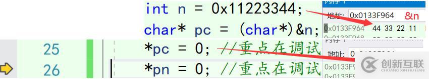 通過對(duì)pc進(jìn)行解引用操作,按ctrl+F10進(jìn)行逐語句調(diào)試過程,按F10到25行,再按一次調(diào)試25行代碼跳到26行,可以觀察25行程序運(yùn)行的情況:觀察內(nèi)存變化發(fā)現(xiàn)內(nèi)存由0x11223344變成了0x11223300。*pc對(duì)pc進(jìn)行解引用操作并賦值為0,因?yàn)閜c是Char類型指針,訪問一個(gè)字節(jié)的內(nèi)存空間,所以將內(nèi)存地址的低位44改成了00。