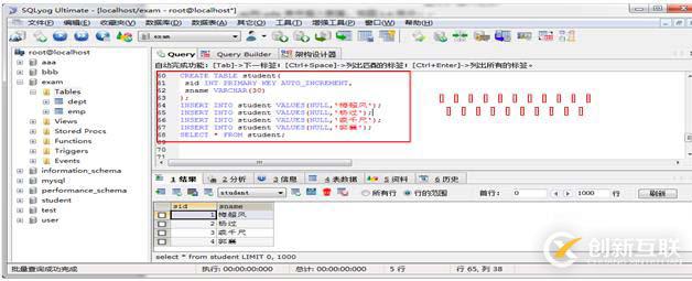 (1)創(chuàng)建student表,然后向student表中插入四條記錄,最后查詢該表,如圖1-5所示: