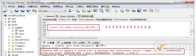 圖1-4中,向wife表中插入一條記錄,主鍵值為4,wid不僅僅是wife表的主鍵,也是外鍵,它的值是引用husband表的主鍵值,而在husband表中并不存在值為4的主鍵,因此插入失敗。