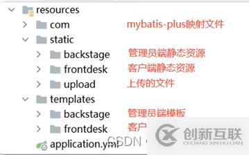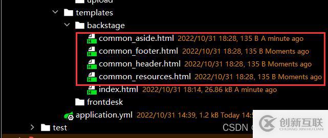 然后咱們在控制器終寫的前臺頁面都在frontdesk下,后端頁面都在backstage下,咱們的模板引擎用的是thymeleaf,要放到resources下的templates下,所以咱們要在 templates 下創(chuàng)建frontdesk包和backstage包。然后咱們在backstage下隨便寫一個html來測試一下。