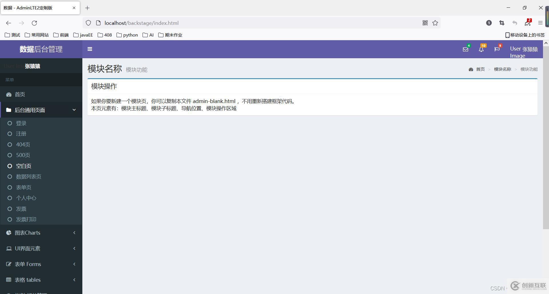 1.將下載好的AdminLTE的靜態(tài)資源復制到/static/backstage中(其中有自己加的少許js文件)。