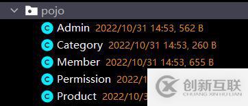 pojo型實體類分為六個,分別是管理員,旅游產(chǎn)品類型,前臺用戶,權(quán)限,產(chǎn)品,角色(代碼略)。