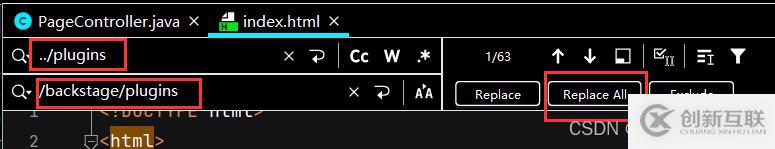 AdminLTE資源中的pages文件夾下的all-admin-blank.html文件就是首頁,所以咱們要把它復制到templates/backstage下,為了可讀性,咱們給它改一個名字為index.html,然后咱們需要把這個文件中的一些引入css文件的路徑給修改一下,因為咱們在static和templates下都創(chuàng)建frontdesk和backstage文件,所以按Ctrl+R進行替換
