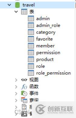 二.項目搭建 1.創(chuàng)建項目將數(shù)據(jù)庫腳本導入數(shù)據(jù)庫(admin是管理員表,role是角色表,admin_role是管理員與角色得一個中間表,permission是權(quán)限表,role_permission是角色和權(quán)限的一個中間表,category是旅游產(chǎn)品的一個類別,member是用戶表,product是旅游產(chǎn)品表,favorite是用戶旅游產(chǎn)品的收藏表)