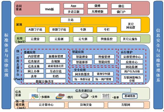 應(yīng)用支撐平臺在整個網(wǎng)站體系架構(gòu)中,起著承上啟下的作用,為政府網(wǎng)站的建設(shè)、管理、維護及網(wǎng)站上各類應(yīng)用和服務(wù)提供技術(shù)支撐,為網(wǎng)站運行提供了軟件環(huán)境。應(yīng)用支撐平臺優(yōu)先選用PaaS+SaaS私有云云服務(wù)方式,平臺必須穩(wěn)定、安全,平臺開放性和可擴展性是滿足個性化需求的關(guān)鍵。若一級政府建設(shè)一個集約平臺,建議標準先行、分步遷移。此類集約方式技術(shù)難度小、見效快、安全風險集中,容易被少數(shù)廠家壟斷。