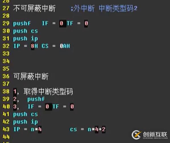 ;我們將地址放到ds中,所以第一步可省,那么就剩(標(biāo)志寄存器入棧)->(if=0,tf=0)->(cs、ip入棧)->(ip=n*4,cs=n*4+2)