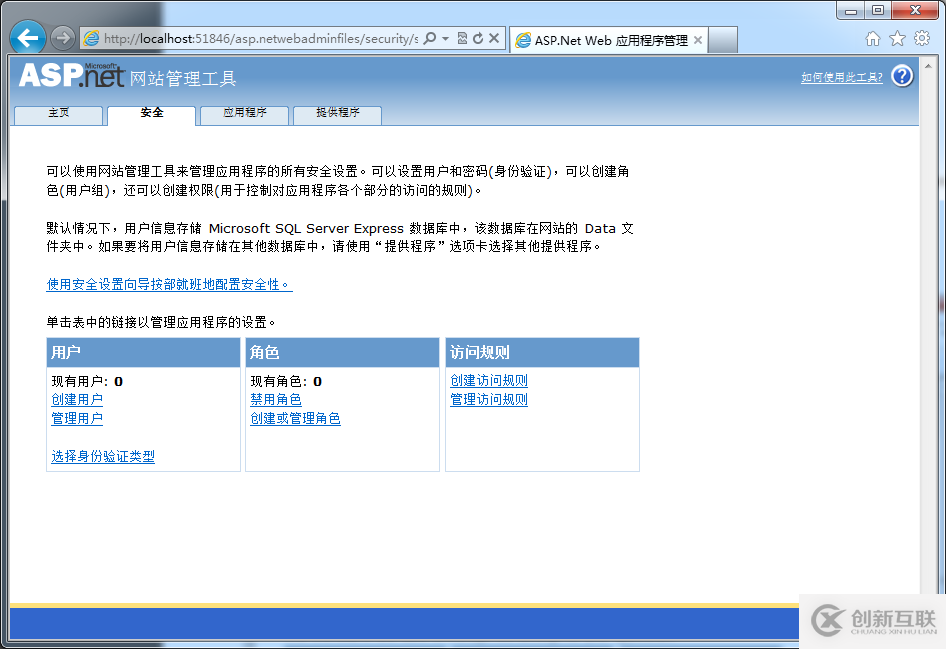 在我們授權(quán)訪問(wèn)網(wǎng)站之前,需要先創(chuàng)建一個(gè)管理員賬號(hào),最簡(jiǎn)單的方式就是使用內(nèi)建的 ASP.NET 站點(diǎn)管理工具創(chuàng)建。