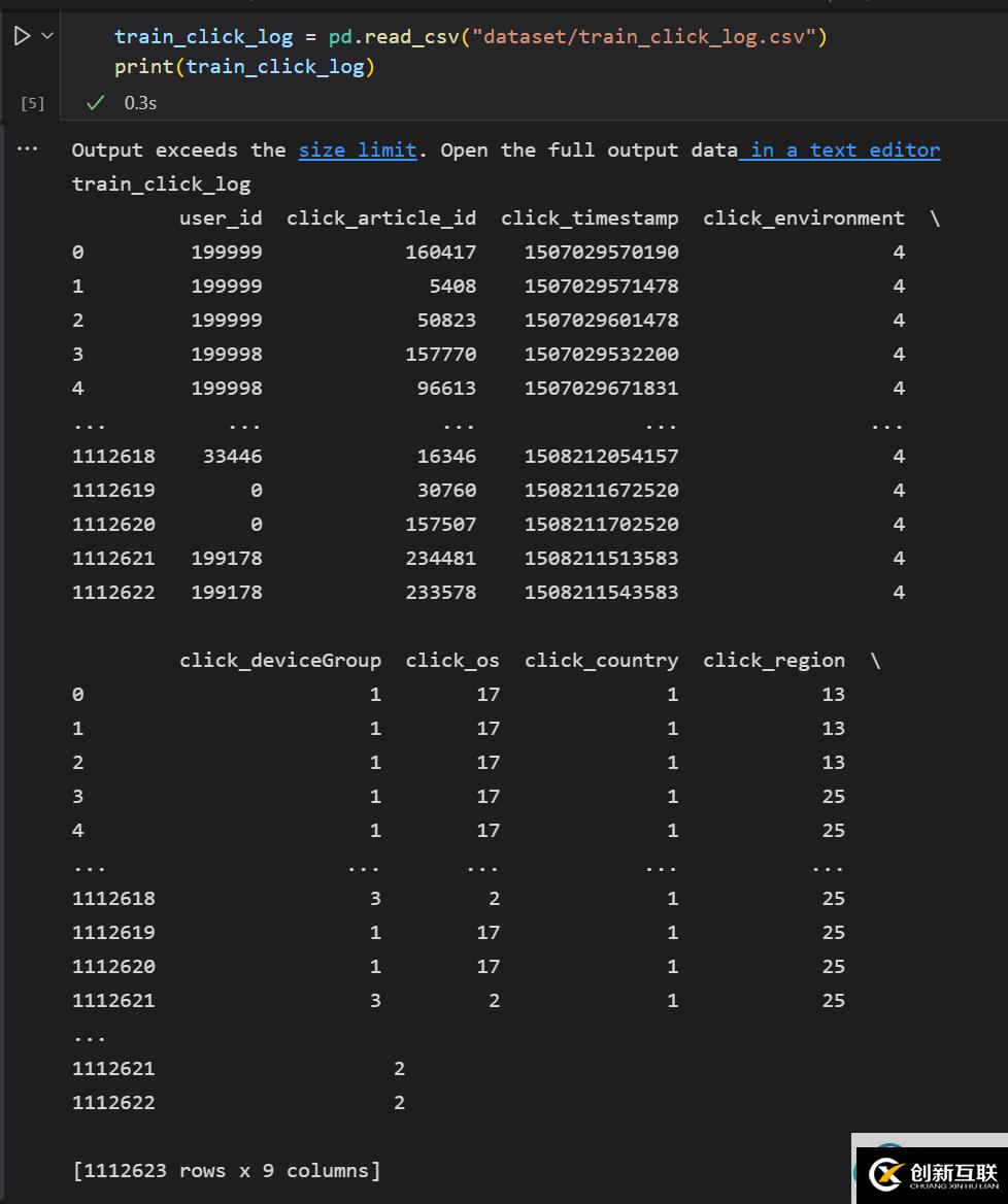 該數(shù)據(jù)共518010行,9列,第一列是用戶id,第二列是該用戶點(diǎn)擊的文章id,第三列是閱讀該文章的時(shí)間,第四列是點(diǎn)擊該文章的環(huán)境(不懂環(huán)境表示什么),第五列是點(diǎn)擊設(shè)備組(不懂設(shè)備組表示什么,是手機(jī)還是電腦還是平板嗎?)第六列是點(diǎn)擊操作系統(tǒng)(感覺(jué)是是windows還是ios還是linux還是android這些),第7列是點(diǎn)擊國(guó)家,第8列是點(diǎn)擊地區(qū),第9列是點(diǎn)擊來(lái)源類型(感覺(jué)類似于從網(wǎng)頁(yè)點(diǎn)擊還是聊天窗口點(diǎn)擊還是朋友圈點(diǎn)擊這種),是記錄了不知道5萬(wàn)用戶(賽題說(shuō)明中有說(shuō)總共包括30萬(wàn)用戶,近300萬(wàn)次點(diǎn)擊,從中抽取20萬(wàn)用戶的點(diǎn)擊日志數(shù)據(jù)作為訓(xùn)練集,5萬(wàn)用戶的點(diǎn)擊日志數(shù)據(jù)作為測(cè)試集A,5萬(wàn)用戶的點(diǎn)擊日志數(shù)據(jù)作為測(cè)試集B)在哪個(gè)國(guó)家哪個(gè)地區(qū)通過(guò)XX渠道,在XX環(huán)境,XX設(shè)備組上,用XX操作系統(tǒng),閱讀了哪篇文章。