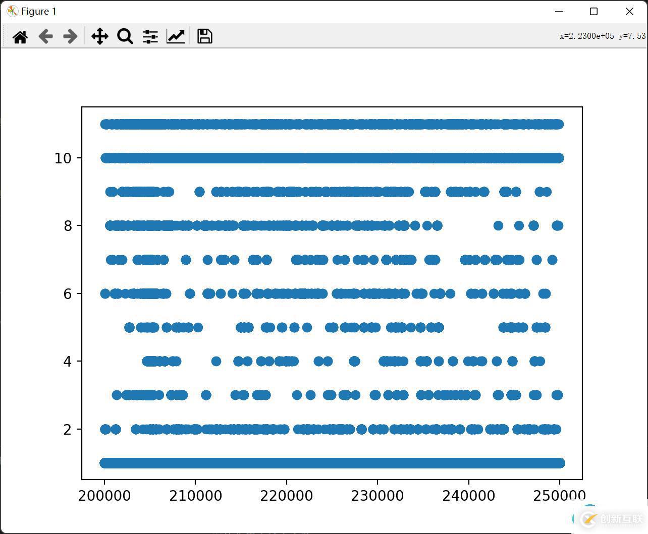訓(xùn)練集和測(cè)試集用戶分布的城市范圍都是一樣的,都是1~11這11個(gè)城市。繪制出訓(xùn)練集20w用戶的城市分布,由于點(diǎn)數(shù)太多,很難看出什么,大概能看出大多數(shù)人都在1、10、11城市點(diǎn)擊過(guò)。