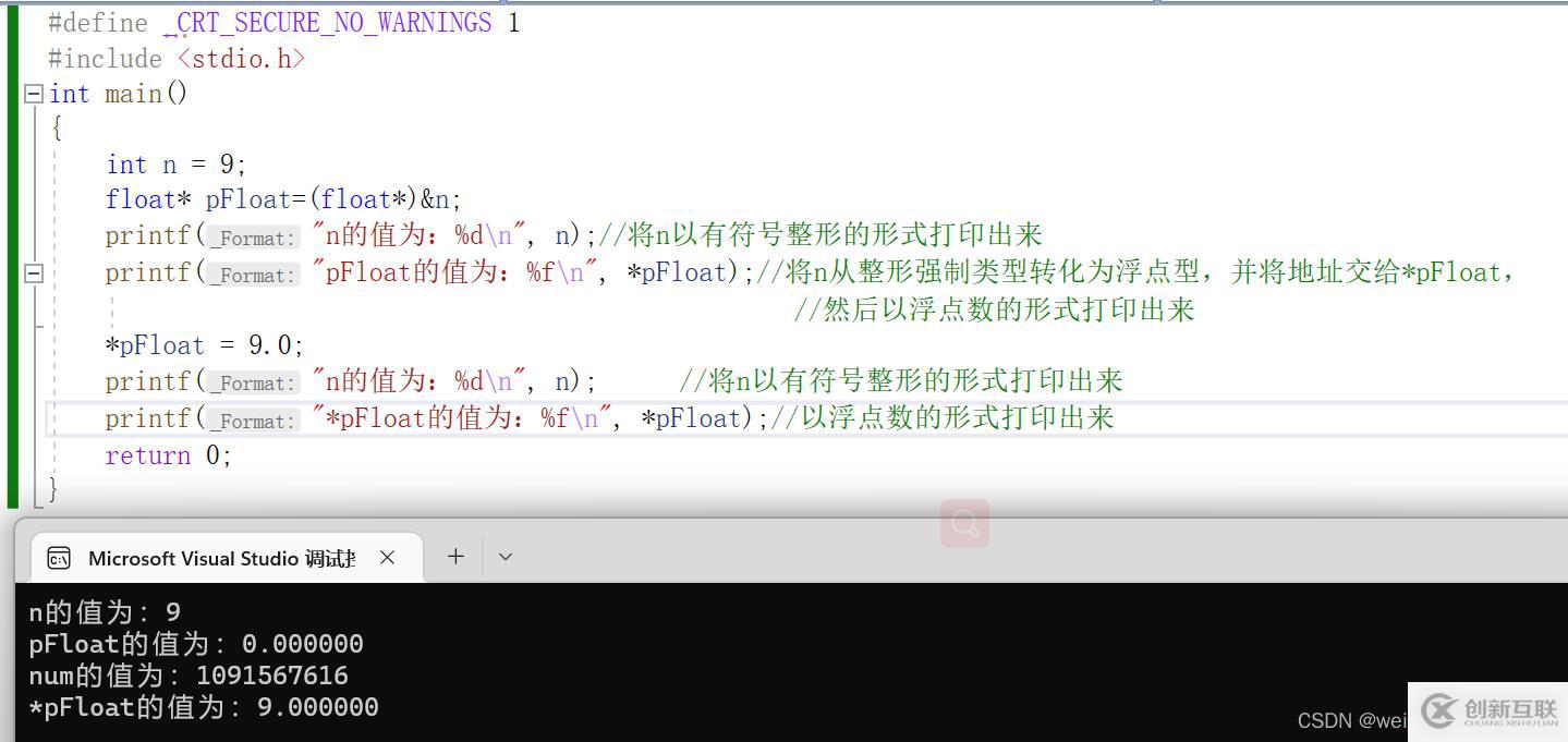 printf("pFloat的值為:%f\n", *pFloat);//將n從整形強(qiáng)制類型轉(zhuǎn)化為浮點(diǎn)型,并將地址交給*pFloat,