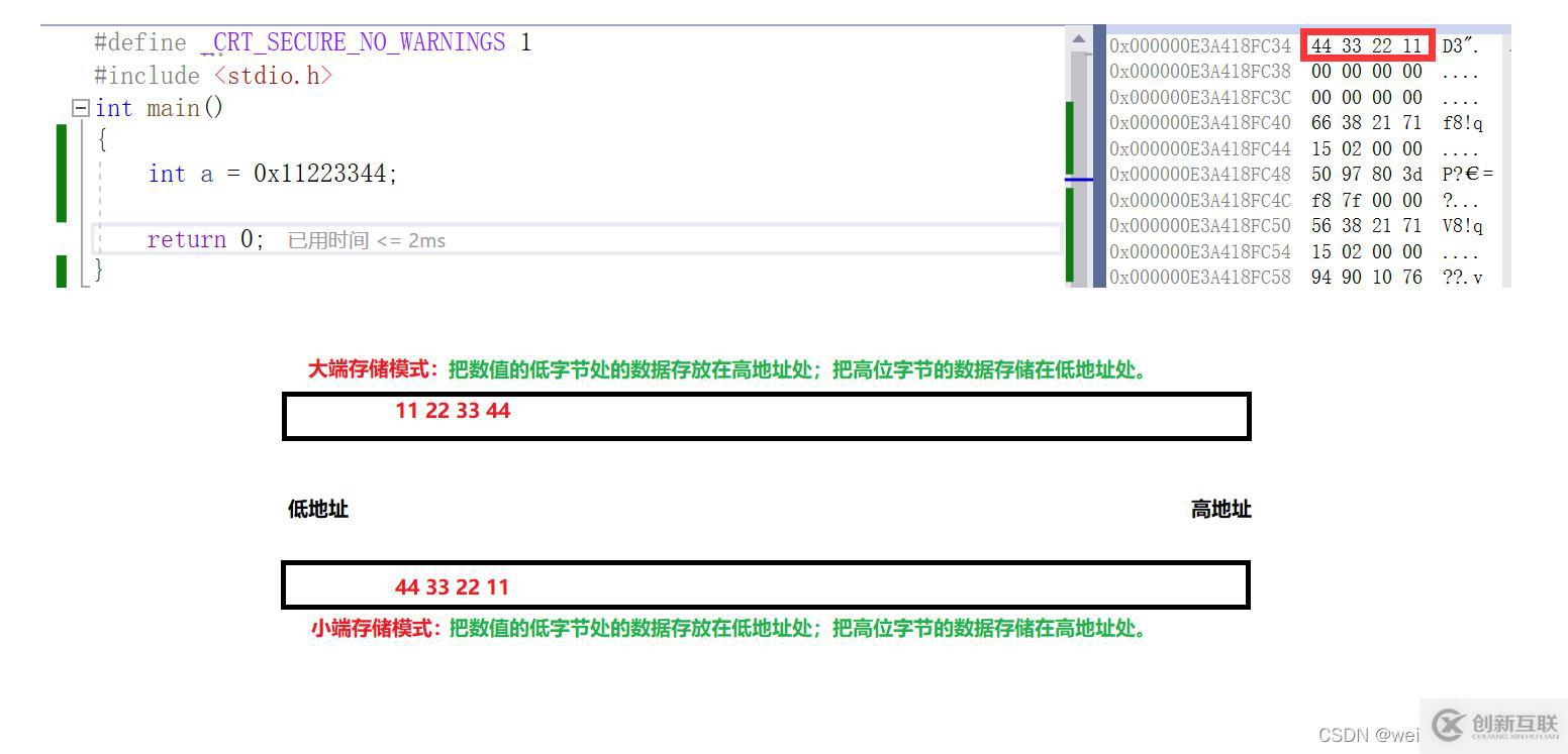 小端(存儲)模式:是指數(shù)據(jù)的低位保存在內(nèi)存的低地址中,而數(shù)據(jù)的高位,保存在內(nèi)存的高地址中。