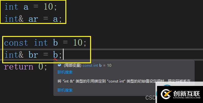 下面這個代碼中用ar引用 a沒問題,可是用br引用一個const修飾的變量b時,出現(xiàn)了問題,