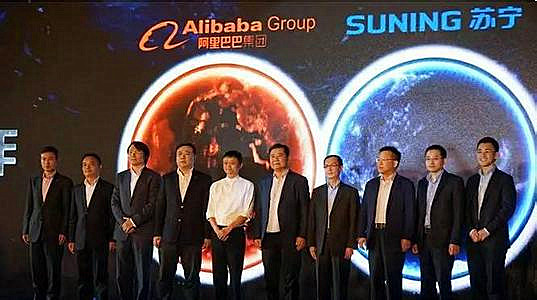 去年8月10日,阿里巴巴集團(tuán)宣布投資約283億元參與蘇寧云商集團(tuán)的非公開發(fā)行,占發(fā)行后總股本的19.99%,成為其第二大股東。同時(shí),蘇寧云商以140億元人民幣認(rèn)購不超過2780萬股的阿里巴巴新發(fā)行股份。