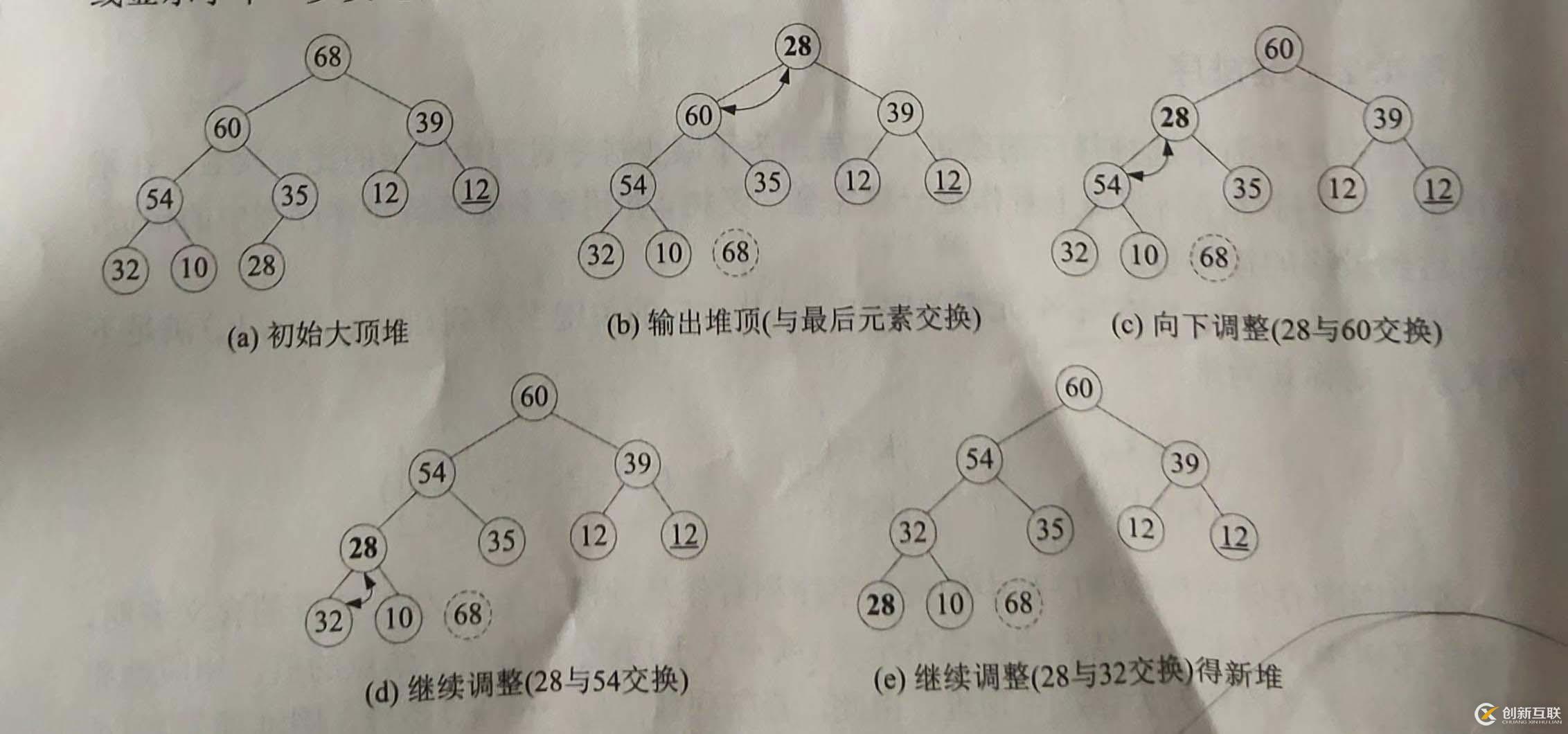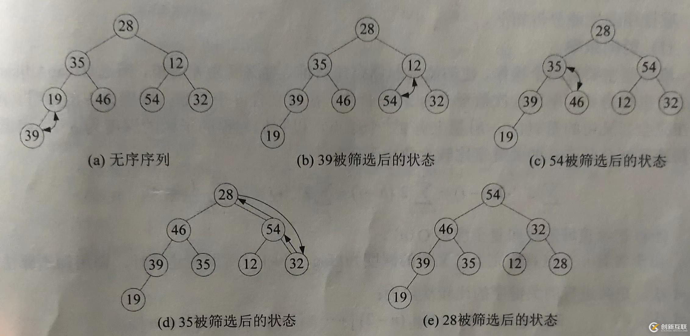 ①取正整數(shù)d(d ②縮小增量d,例如取d=[a/2],重復(fù)上述過(guò)程,再對(duì)每個(gè)子序列分別進(jìn)行直接插入排序。 ③最后取d=1,將待排序序列放在一起進(jìn)行一 次直接插入排序。 例如,待排序的初始關(guān)鍵字序列為28,35,12, 19,46, 54, 12,09,15,33,進(jìn)行希爾排序的過(guò)程如圖: (1) 時(shí)間效率 算法的效率取決于增量的取值,這是一個(gè)未解決的數(shù)學(xué)難題。 希爾增量般的取值是d=[n/2」, 并且最后一個(gè)增量- 定為1。排序中子序列的構(gòu)成不是簡(jiǎn)單的“逐段分割”,而是將相隔某個(gè)增量的記錄組成一個(gè)子序列。當(dāng)增量采用Hibbard增量時(shí),,希爾排序的時(shí)間復(fù)雜度為0(n的1.5次方)希爾排序時(shí)間復(fù)雜度的下界是O(nlog2n)。 (2) 空間效率 本算法只需要個(gè)輔助空間, 用來(lái)作為“哨兵”,所以空間復(fù)雜度 S(n)=O(1)。 (3)穩(wěn)定性 在不同子序列的插入排序過(guò)程中,相同的元素可能在各自的插入序列中移動(dòng),最后其穩(wěn)定性就會(huì)被打亂,所以希爾排序是不穩(wěn)定的排序方法。 快速排序是基于分治法的一種排序方法,是對(duì)冒泡排序的一種改進(jìn),他是目前內(nèi)部排序中排序速度較快的一種方法。 基本思想:通過(guò)一趟排序?qū)⒋判蛴涗浄指畛瑟?dú)立的兩部分,其中一部分的關(guān)鍵字均不大于另一部分的關(guān)鍵字,可分別對(duì)這兩部分記錄繼續(xù)進(jìn)行排序,以達(dá)到整個(gè)序列有序的目的 內(nèi)部排序:排序記錄放在計(jì)算機(jī)存儲(chǔ)器里面進(jìn)行的 進(jìn)們快速排序的具體過(guò)程如下。 對(duì)R[s], . R[t]中的記錄進(jìn)行一趟快速排序, 附設(shè)兩個(gè)指針low 和high,設(shè)置一個(gè)板軸記錄R[0]=R[s],pivotkey=R[s] .key。 ①令10ow=s, high=t,并保存low位置的記錄。 ②從high所指位置起向low所指位置方向搜索,找到第1個(gè)關(guān)鍵字不大于pivotkey的記錄,放在low位置處,并使low++。 ③從low所指位置起向high所指位置方向搜索,找到第1個(gè)關(guān)鍵字不小于pivotkey的記錄,放在high位置處,并使high--。 ④重復(fù)②、③兩步,直至low=high為止(此時(shí)整個(gè)序列被分成有序的前后兩塊)。⑤將軸元素放在low位置處。 ⑥再分別對(duì)兩個(gè)子序列進(jìn)行快速排序,直到每個(gè)子序列只含有一個(gè)記錄為止。每一趟快速排序,都可將樞軸元素放在其最終的位置上。 例如,待排序的初始關(guān)鍵字序列為(28, 35,12, 19, 46, 54, 12, 39),進(jìn)行快速排的過(guò)程如圖: 教材上是線性表實(shí)現(xiàn)的,而且有點(diǎn)復(fù)雜,我就用到之前的方法寫(xiě)的代碼,也是相同的思想 選擇排序基本思想:每一趟從待排序的記錄中選出關(guān)鍵字最小記錄,按順序放在已排好序的子序列的最后,直到全部記錄排序完畢。 簡(jiǎn)單選擇排序是選擇排序中最簡(jiǎn)單的-種排序方法,其基本思想是:第i(1≤i 簡(jiǎn)單選擇排序的具體過(guò)程如下。 ①讓i等于1。 ②取R[i].key,依次與記錄R[i+1]~R[n]的關(guān)鍵字進(jìn)行比較,找出從第i條記錄到第n條記錄中關(guān)鍵字最小的記錄L.R[j],交換L.R[i]與L.R[j],使第i個(gè)位置上的記錄成為從第i個(gè)記錄起到第n個(gè)記錄為止的記錄序列中關(guān)鍵字最小的記錄。 ③讓i的值增加1,轉(zhuǎn)向②,直到對(duì)R[n-1].key與R[n].key進(jìn)行比較并進(jìn)行相應(yīng)的處理為止,最終得到一一個(gè)有序的序列。 堆排序是對(duì)簡(jiǎn)單選擇的改進(jìn),主要是為了減少排序過(guò)程中記錄的比較次數(shù)。在堆排序中,將待排序列邏輯上看作是一顆完全二叉樹(shù),并用堆來(lái)選擇待排序列的極值,從而達(dá)到最終的排序目的。 堆的定義:對(duì)于含有n個(gè)元素的序列,若其對(duì)應(yīng)的關(guān)鍵字序列,滿(mǎn)足下列關(guān)系: 若將順序存儲(chǔ)的待排序中的關(guān)鍵字序列看作是一棵完全二叉樹(shù),則堆的含義表明:完全二叉樹(shù)中所有非終端結(jié)點(diǎn)的值均不小于(或者不大于)其左、右孩子結(jié)點(diǎn)的值,相應(yīng)的這樣的完全二叉樹(shù)稱(chēng)為大(或者小)頂堆。即堆頂元素為序列中的大值(或者最小值) 將無(wú)序序列建成- 個(gè)堆,得到關(guān)鍵字大(或最小)的記錄,輸出堆頂元素后,將剩余的n-1個(gè)元素重新建成一個(gè)堆,則可得到n個(gè)元素中關(guān)鍵字次大(或次小)的記錄,重復(fù)執(zhí)行該操作,最終得到一個(gè)有序序列,這個(gè)過(guò)程就稱(chēng)為堆排序。 實(shí)現(xiàn)堆排序需要解決如下兩個(gè)問(wèn)題。 ①初建堆,即如何將一個(gè)無(wú)序序列建成一個(gè)堆。 ②調(diào)整堆,即如何在輸出堆頂元素后,調(diào)整剩余元素成為一個(gè)新堆。 先考慮堆的調(diào)整問(wèn)題。設(shè)當(dāng)前所使用的堆為大頂堆,首先將堆頂元素與最后一個(gè)元素進(jìn)行交換。此時(shí),不包含最后一個(gè)元素的完全二叉樹(shù)就失去了堆的性質(zhì),不再是一個(gè)堆了,但根結(jié)點(diǎn)的左右子樹(shù)均為堆,因此可以從根結(jié)點(diǎn)開(kāi)始,自上而下進(jìn)行調(diào)整。 將堆頂元素與左右子樹(shù)的根結(jié)點(diǎn)中關(guān)鍵字較大者進(jìn)行比較,若堆頂元素小于子樹(shù)根結(jié)點(diǎn)的值,則堆頂結(jié)點(diǎn)與子樹(shù)根結(jié)點(diǎn)交換。因?yàn)榻粨Q可