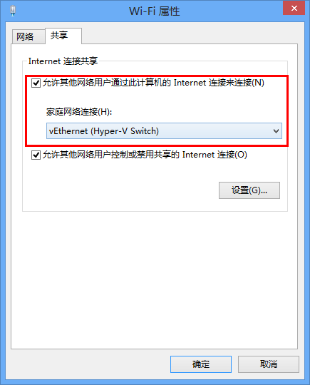 切換到"共享"標簽下,勾選"允許其他網絡用戶通過此計算機的Internet連接來連接"并在下方"家庭網絡連接"中選擇剛剛創(chuàng)建的虛擬交換機——vEthernet (Hyper-V Switch),點擊"確定"。