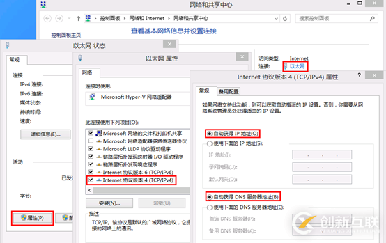 此時再重新啟動Hyper-V虛擬機,在對應的網絡連接下面的TCP/IP協(xié)議中設置為"自動獲取IP地址"和"自動獲取DNS服務器",則可進行網絡連接。