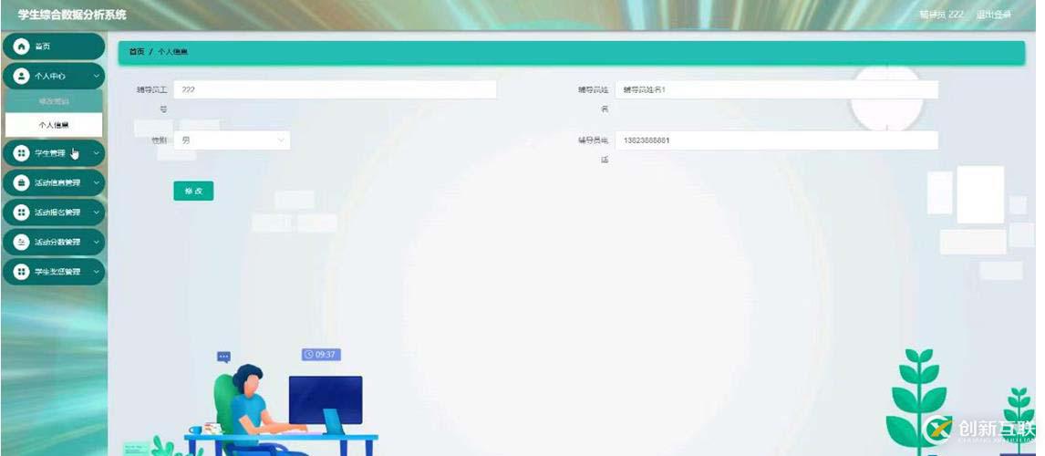 個人中心,在個人信息頁面可以通過填寫輔導(dǎo)員工號,性別,輔導(dǎo)員姓名,輔導(dǎo)員電話等內(nèi)容來進行個人信息修改操作,如圖4-3所示。