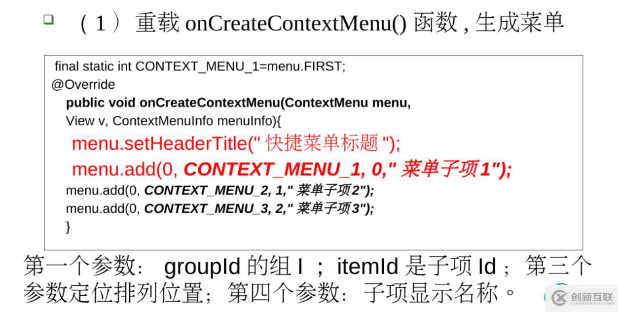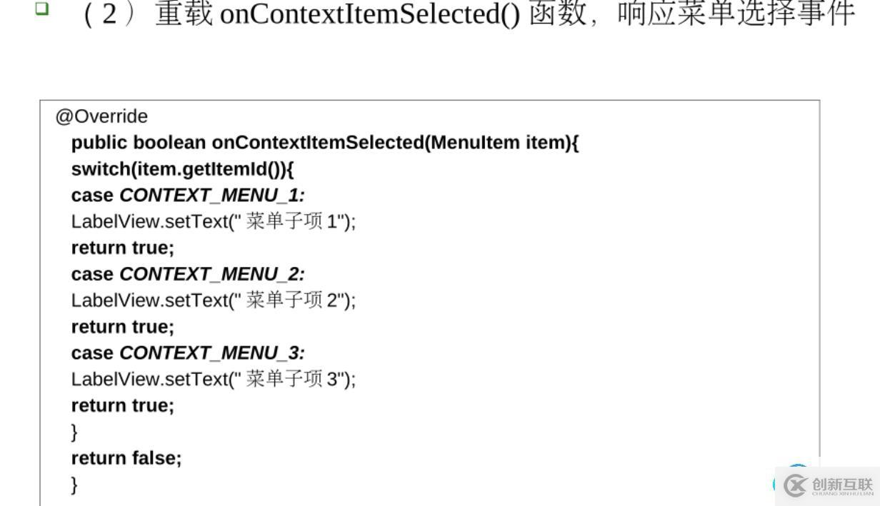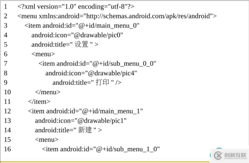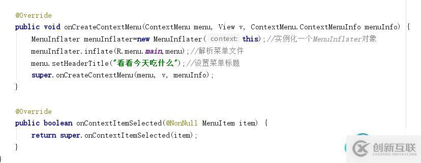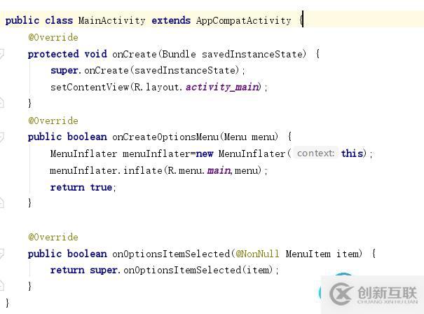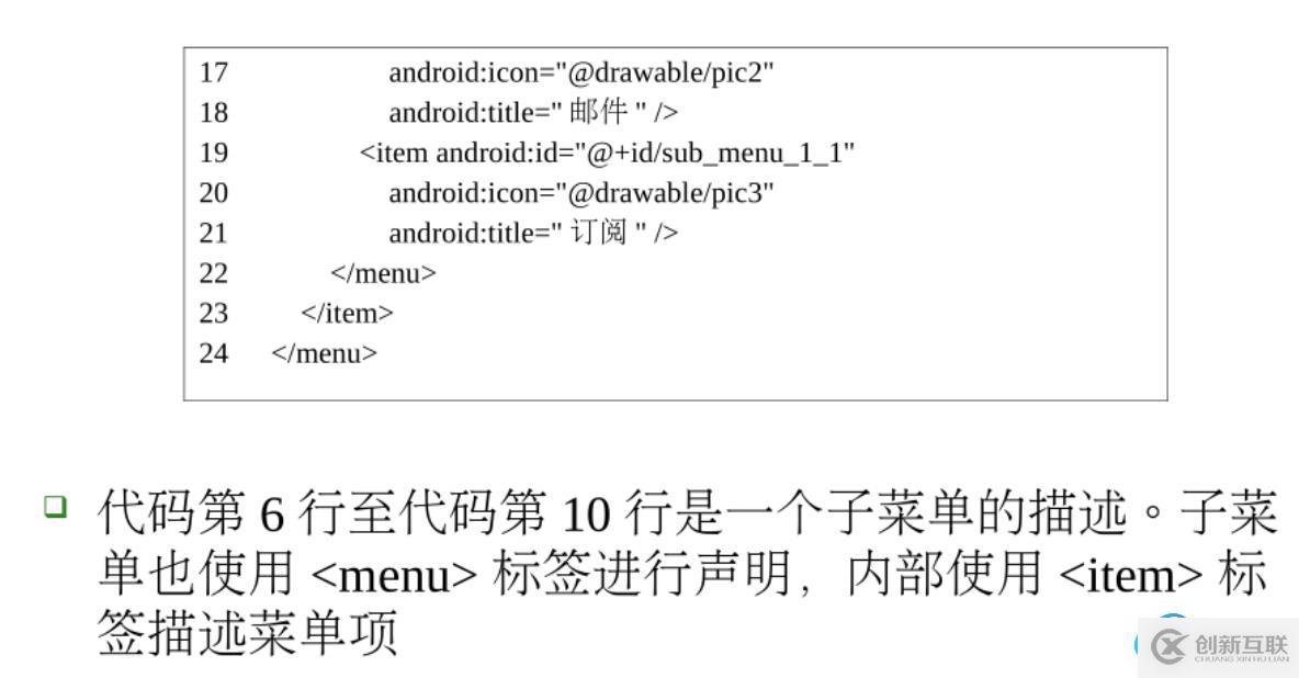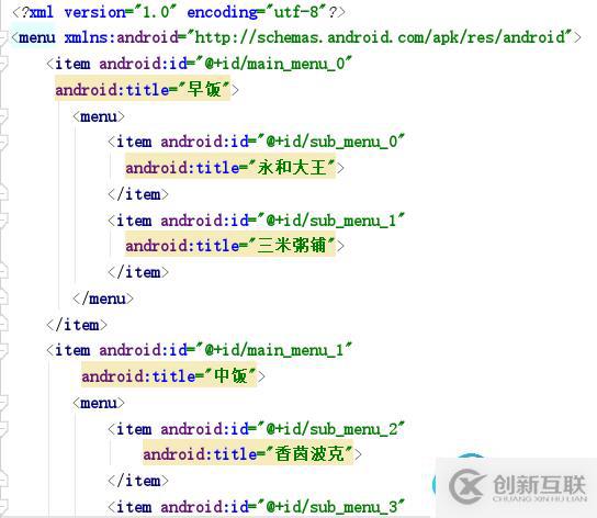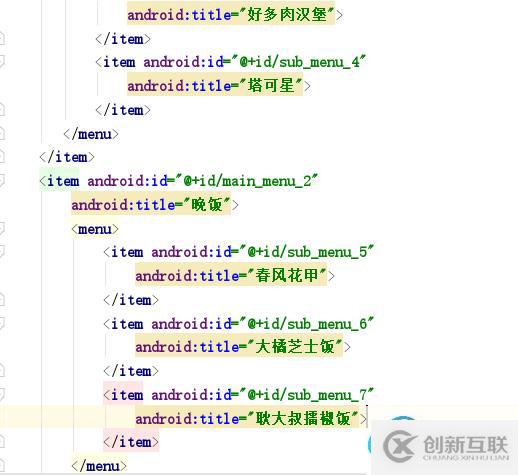 包住,里面的項就是item,如果要在項下面添加子菜單,那就在MainActivity.java代碼: