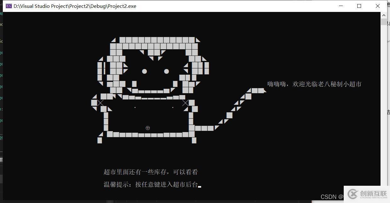 cout<< " ◥ ▇ █ █ ▊ ▊ █ ▇ ◤ 嗨嗨嗨,歡迎光臨老八秘制小超市"<< endl; //歡迎界面