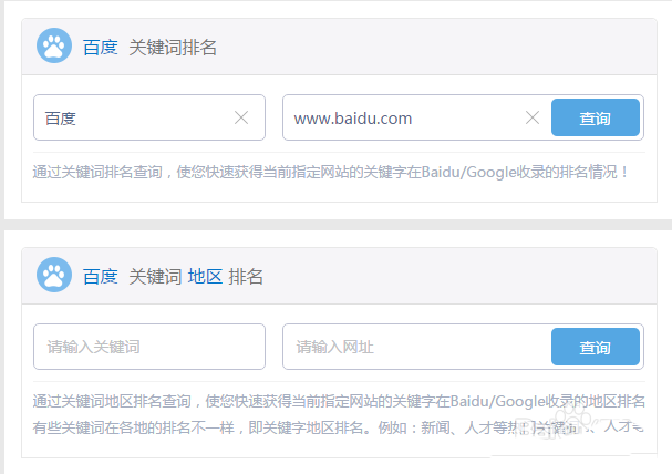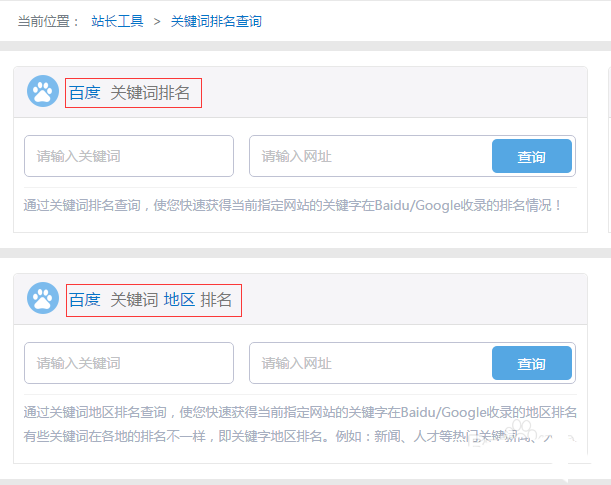 3、打開以后,頁面上有“百度關(guān)鍵詞排名查詢”和“百度關(guān)鍵詞地區(qū)排名查詢”兩個搜索框。