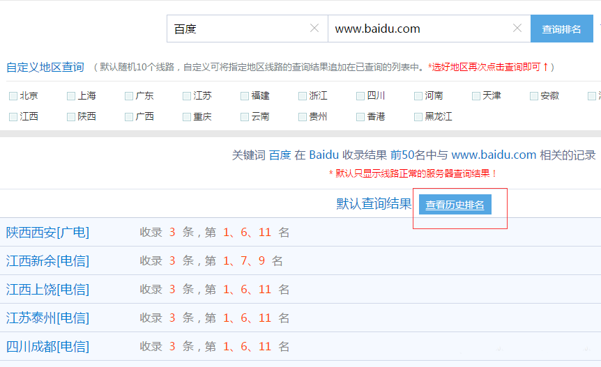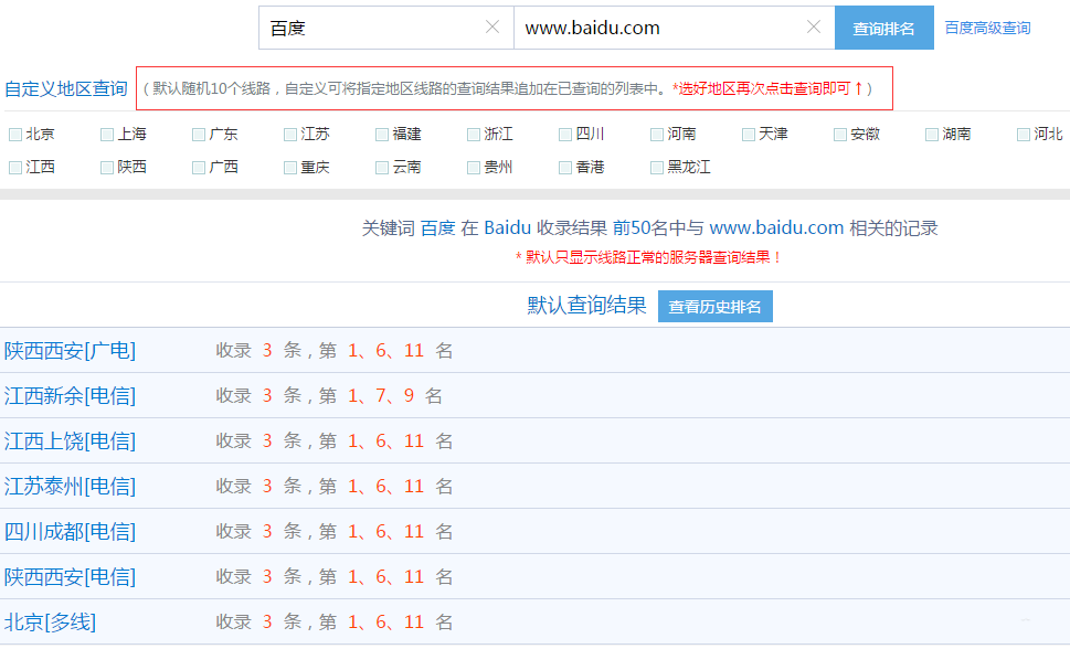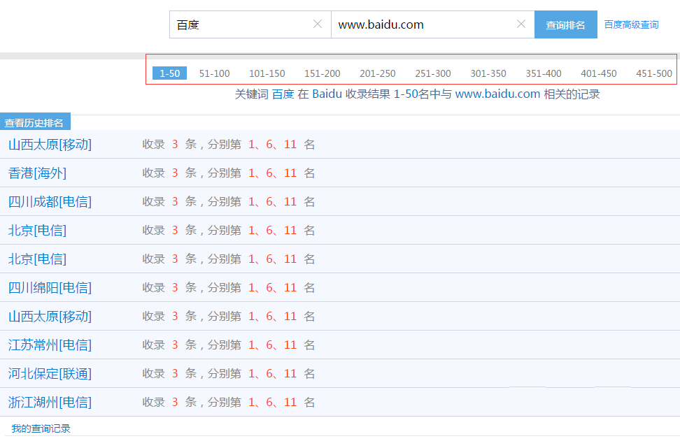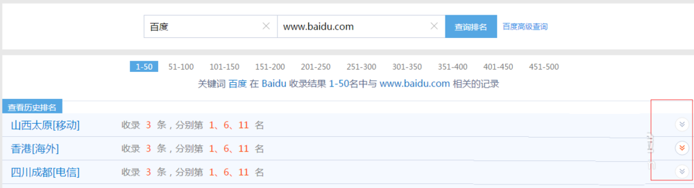 5、第一個搜索框,算是綜合查詢,結(jié)果是隨機的地區(qū)排名。第二個搜索框,是地區(qū)排名查詢,結(jié)果默認(rèn)顯示1到50名是否有排名,依次類推。