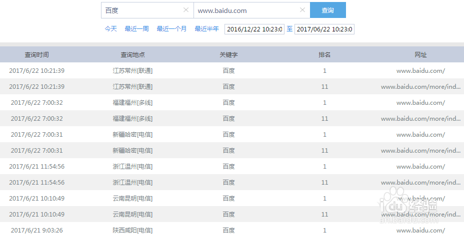 4、我們以“百度”這個關(guān)鍵詞為例,查詢百度這個網(wǎng)站在搜索引擎中的排名。