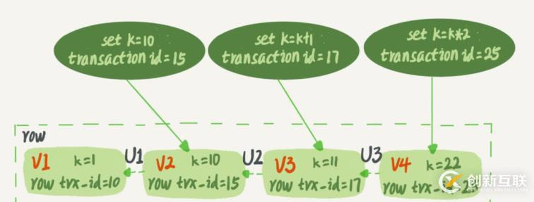 每次對數(shù)據(jù)庫記錄進(jìn)行改動,都會記錄一條undo日志,每條undo日志也都有一個roll_pointer屬性(INSERT操作對應(yīng)的undo日志沒有該屬性,因為該記錄并沒有更早的版本),可以將這些undo日志都連起來,串成一個鏈表,所以現(xiàn)在的情況就像下圖一樣: