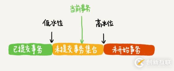 數(shù)組里面事務(wù)ID的最小值記為低水位,當(dāng)前系統(tǒng)里面已經(jīng)創(chuàng)建過的事務(wù)ID的大值加1記為高水