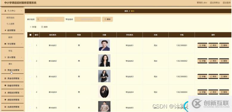 家長管理,在家長管理頁面可以對(duì)索引、家長姓名、性別、頭像、學(xué)生姓名、關(guān)系、手機(jī)等內(nèi)容進(jìn)行詳情,修改或刪除等操作,如圖5-11所示。