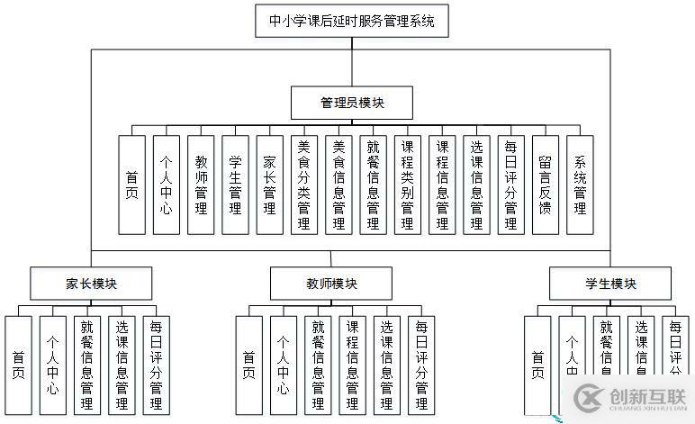 3.3功能分析考慮到實(shí)際生活中在中小學(xué)課后延時(shí)服務(wù)管理方面的需要以及對(duì)該系統(tǒng)認(rèn)真的分析,將系統(tǒng)權(quán)限按管理員、教師、學(xué)生和家長這四類涉及用戶劃分。