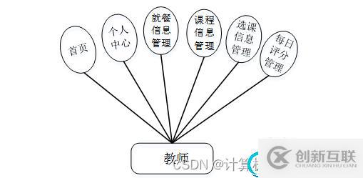 教師登陸后,主要模塊包括首頁、個(gè)人中心、就餐信息管理、課程信息管理、選課信息管理、每日評(píng)分管理等功能。教師用例圖如圖3-2所示。