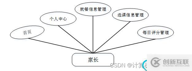 家長登陸后,主要模塊包括首頁、個(gè)人中心、就餐信息管理、選課信息管理、每日評(píng)分管理等功能。家長用例圖如圖3-3所示。
