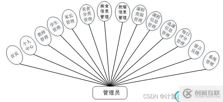 管理員登陸后,主要模塊包括首頁、個(gè)人中心、教師管理、學(xué)生管理、家長管理、美食分類管理、美食信息管理、就餐信息管理、課程類別管理、課程信息管理、選課信息管理、每日評(píng)分管理、留言反饋、系統(tǒng)管理等功能。管理員用例圖如圖3-1所示。