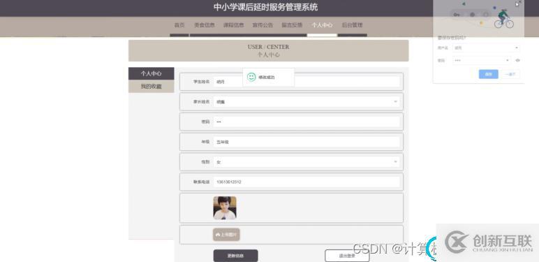 個(gè)人中心,在個(gè)人中心頁面通過填寫用戶信息等內(nèi)容進(jìn)行更新信息操作,根據(jù)需要對(duì)我的收藏進(jìn)行操作,如圖5-6所示。