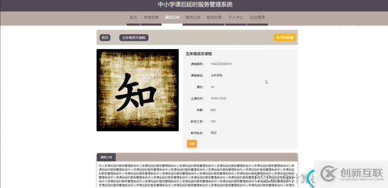 課程信息,在課程信息頁面可以查看課程名稱、課程編號(hào)、課程類別、課時(shí)、上課時(shí)間、學(xué)費(fèi)、教師工號(hào)、教師姓名、課程介紹等內(nèi)容,并進(jìn)行選課操作,如圖5-4所示。
