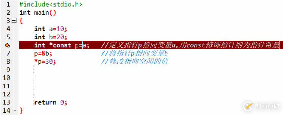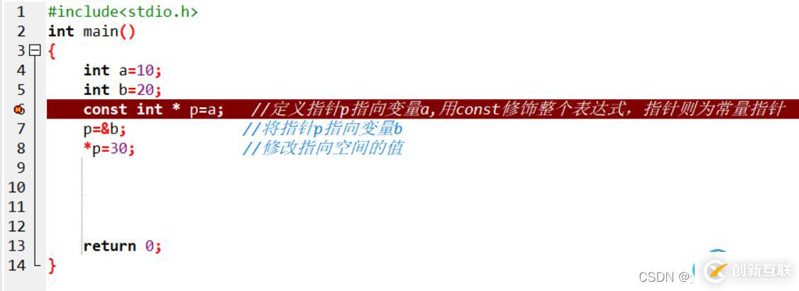 (4)常量指針? 當用const修飾整個定義表達式,cconst int *p,此時指針p為常量指針,即指針指向的空間的值為常量,不可修改,但是指針可以指向其他的空間