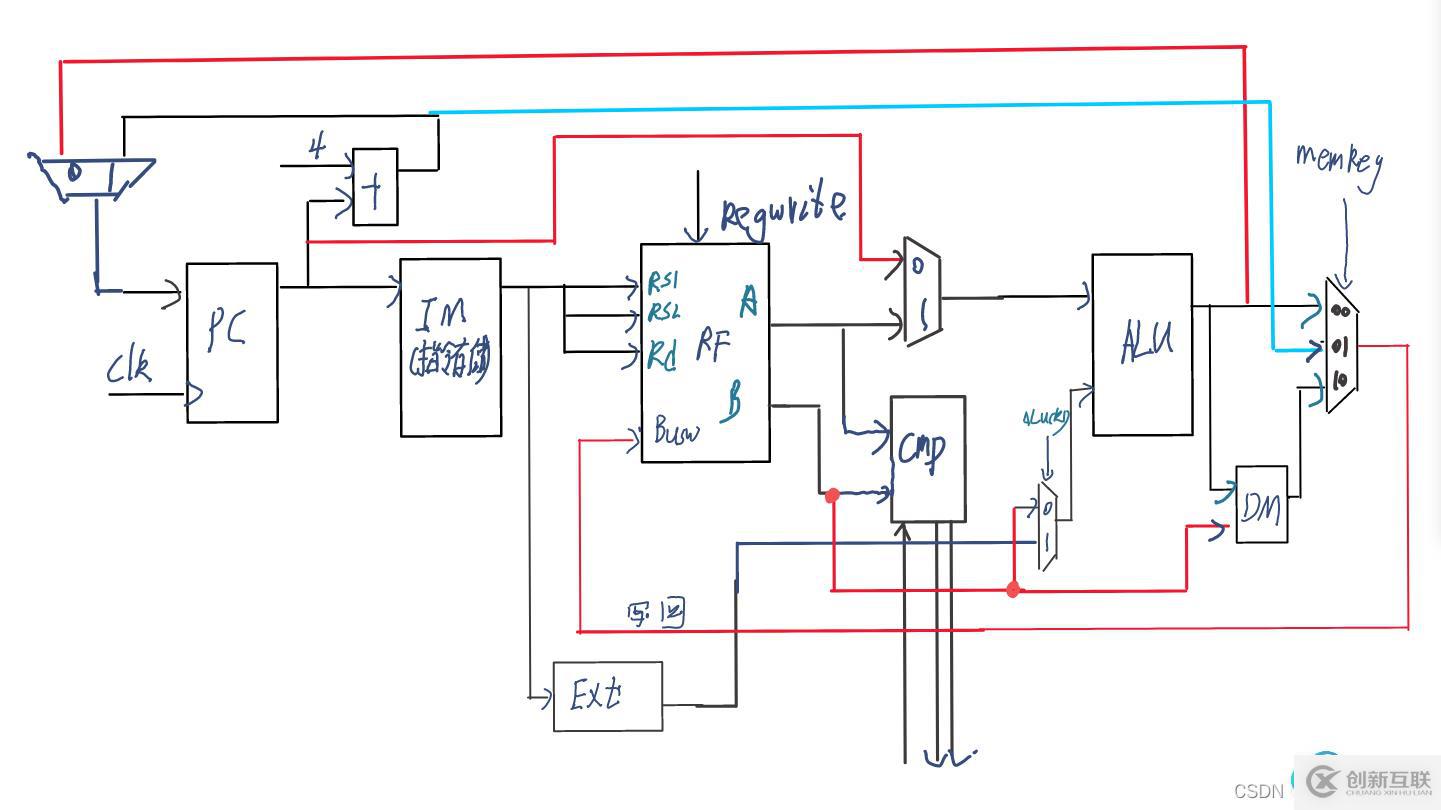 解釋:S型指令與訪存類指令其實(shí)是一個(gè)相反的過程,S型指令是把ALU結(jié)果存儲的存儲器(DM)中去(S型指令不需要寫會寄存器堆,也不需要增加其他模塊)。