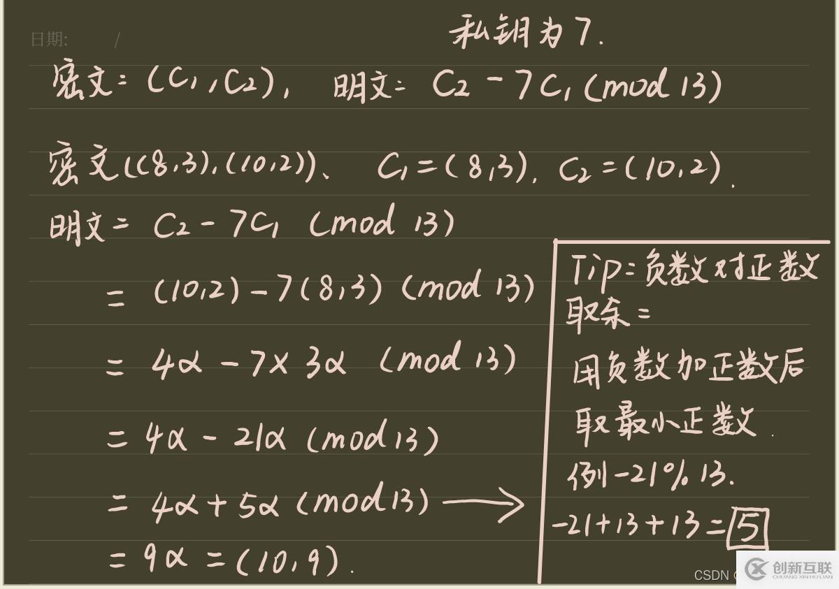 本原元是(2,7),私鑰是為7,隨機(jī)數(shù)為3。輸入的明文一定要在橢圓曲線上,我代碼中沒有關(guān)于這個條件的判斷,讀者可以自行加入。截圖中是對13取余,因?yàn)轭}目中說明了E上有13個點(diǎn)。根據(jù)題目不同要做相應(yīng)的修改。