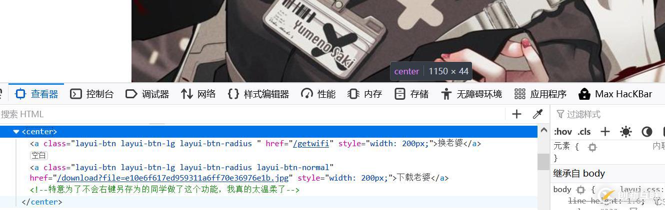 打開首先發(fā)現(xiàn)是一個圖片下載(老婆們都很不錯( ̄▽ ̄)*),感覺也沒什么其他的東西,先F12看一下代碼,發(fā)現(xiàn)有一處標(biāo)注,感覺跟任意文件下載有關(guān):